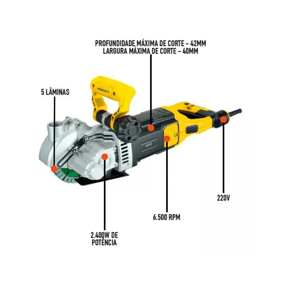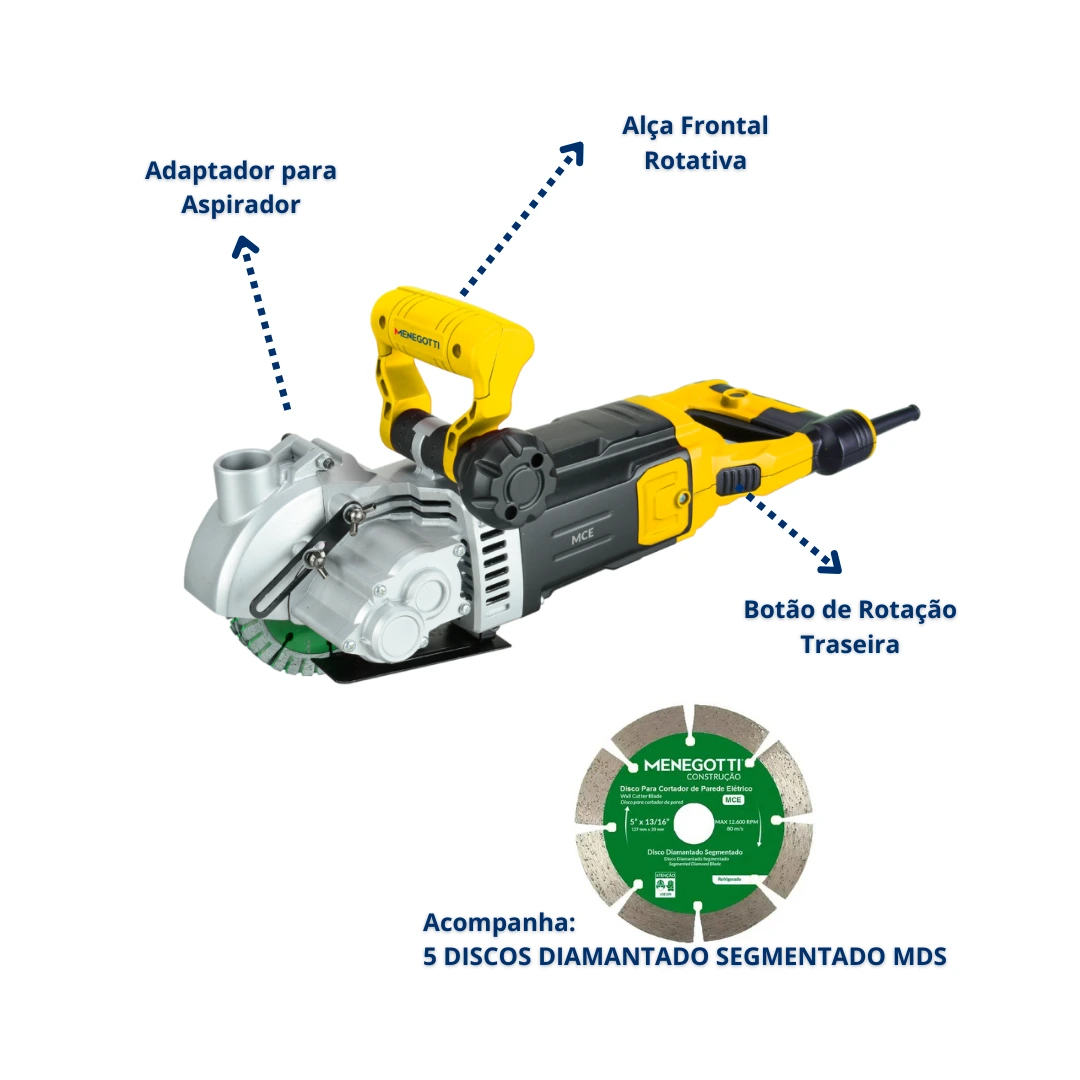 O Cortador de Parede da Menegotti é a solução perfeita para criar canaletas em paredes de maneira ágil e eficiente. Com 5 lâminas, ele realiza cortes rápidos e precisos, ideal para obras em alvenaria, eliminando a necessidade de ferramentas tradicionais como rompedor e talhadeira.